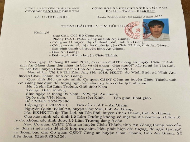 Theo đó, Cơ quan Cảnh sát điều tra Công an huyện Châu Thành, tỉnh An Giang đã ra thông báo truy tìm Lê Lâm Trường (26 tuổi, ngụ ấp Tân Lợi, xã Tân Phú, huyện Châu Thanh) do bị tình nghi đến vụ án giết người nêu trên. Công an xác định Lê Lâm Trường là người bị tình nghi tuy nhiên Trường hiện không có mặt tại địa phương, không rõ lý do.
