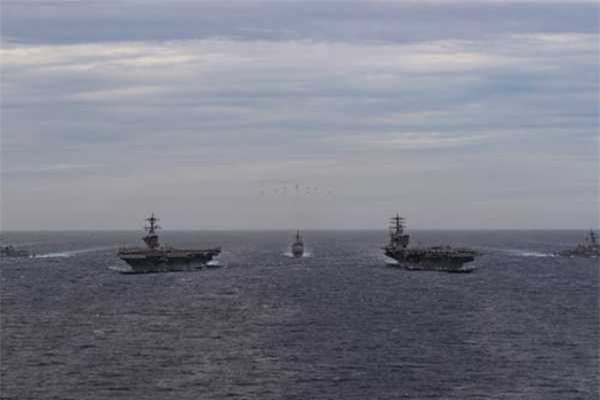 Nhóm tác chiến của các tàu sân bay USS Nimitz và USS Theodore Roosevelt hoạt động trên vùng Biển Đông. Ảnh: Hải quân Mỹ