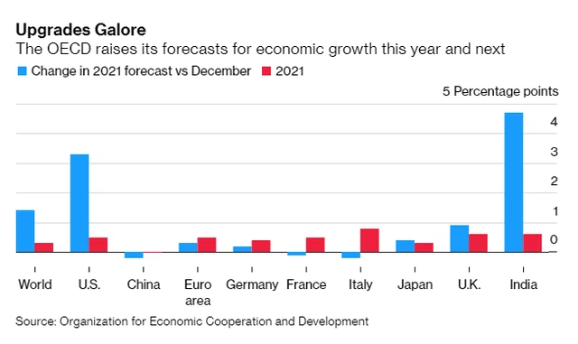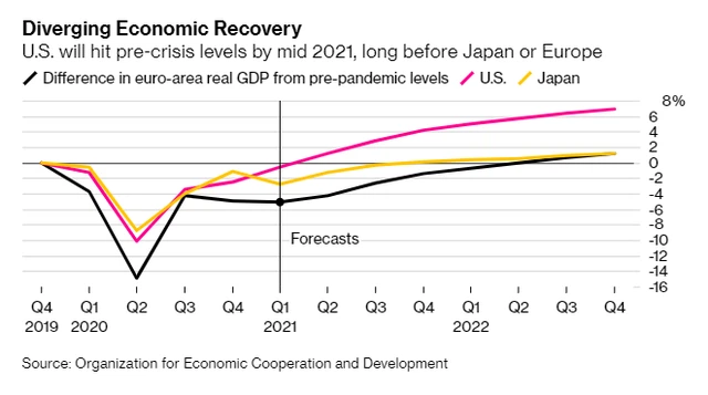 Theo OECD, nền kinh tế toàn cầu vào giữa năm 2021 sẽ vượt mức trước khi đại dịch diễn ra nhờ chiến dịch tiêm chủng cũng như các gói cứu trợ lớn như của Mỹ. Chi phí lãi vay và giá dầu tại Mỹ đã xuống như thời trước đại dịch trong những tuần gần đây và gửi tín hiệu tốt đến thị trường toàn cầu.