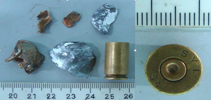 5 mảnh vỡ đầu đạn và vỏ đạn thu được (ảnh trái). Dưới đít vỏ đạn có vết xước đặc trưng ở viền đáy, sẽ được dùng để giám định. Ảnh: Phòng Kỹ thuật Hình sự Công an TP HCM.
