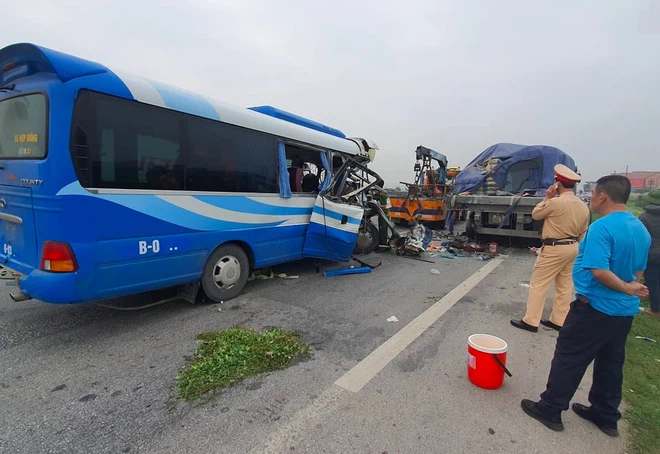 Cú đâm mạnh khiến đầu chiếc xe khách nát bét, hư hỏng nặng. Vụ tai nạn đã khiến anh Nguyễn Văn M. (SN 1961, trú tại Tây Mỗ, Từ Liêm, Hà Nội) tử vong tại chỗ.