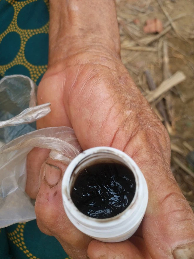 Bà Nhi đưa ra lọ thuốc, nói: “Đây là lọ thuốc mà ông Yên cho, xoa vào chỗ bướu hằng ngày”. Cầm lọ thuốc, chúng tôi không thấy nhãn hiệu, cũng như ghi chú về công dụng. Mở nắp lọ ra, thấy thuốc màu đen, dẻo, có mùi hôi.