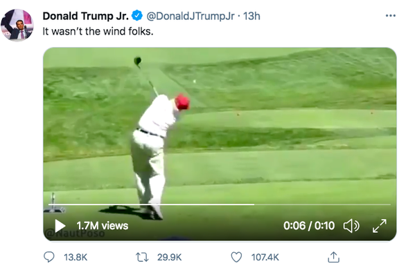 Dòng mô tả “Không phải do gió đâu mọi người!” trên tài khoản Twitter của ông Donald Trump Jr. và ảnh cắt từ clip chế cho thấy ông Trump đánh quả bóng golf trúng vào sau đầu ông Biden – Ảnh chụp màn hình
