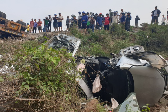Tại hiện trường, xe ôtô đầu kéo bị lật nằm ở phần đường bên trái, 3 chiếc ôtô rơi xuống vực, trong đó có 1 chiếc bị biến dạng.