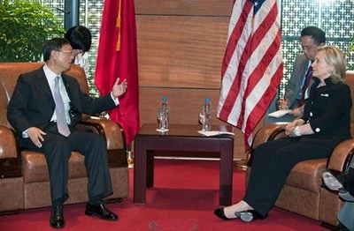 Ngoại trưởng Trung Quốc Dương Khiết Trì và Ngoại trưởng Mỹ Hillary Clinton trong cuộc gặp song phương tại hội nghị của Diễn đàn khu vực ASEAN tại Hà Nội, Việt Nam, ngày 23/7/2010 (Ảnh: Xinhua)