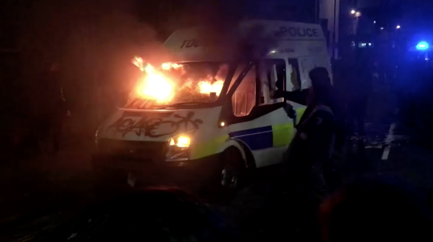 Phía bên ngoài của một đồn cảnh sát ở trung tâm thành phố bị phá hoại. Cảnh sát Avon và Somerset cho biết họ yêu cầu sự giúp đỡ từ các lực lượng lân cận để kiểm soát tình hình. Một nhiếp ảnh gia của Reuters có mặt tại hiện trường chứng kiến một số người biểu tình bắn pháo hoa về phía các cảnh sát, cố gắng xô ngã một chiếc xe cảnh sát, leo lên bức tường bên ngoài của một đồn cảnh sát và phun graffiti lên đó. Ông cũng nhìn thấy cảnh sát, một số người trong trang phục chống bạo động, sử dụng dùi cui và khiên để cố gắng đẩy lùi những người biểu tình.