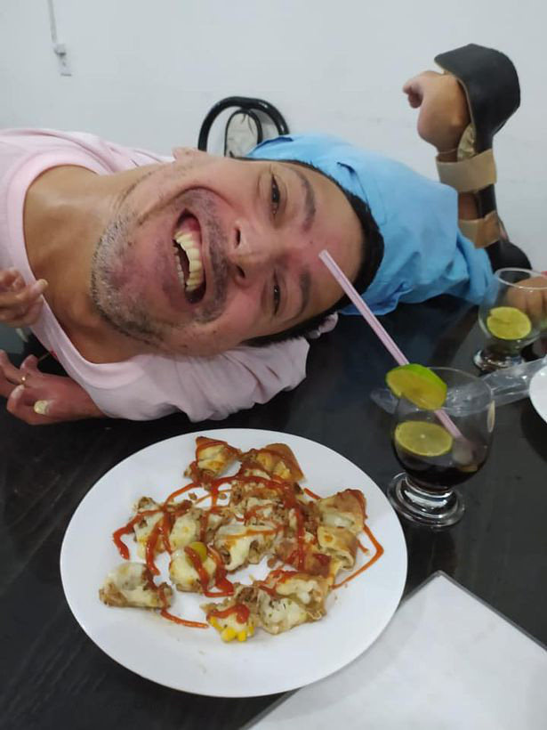 Claudinho bị teo cơ chân, hai cánh tay thì dán vào ngực, và điều nổi bật nhất là cái đầu quay hẳn về phía sau, dựa vào lưng của anh.