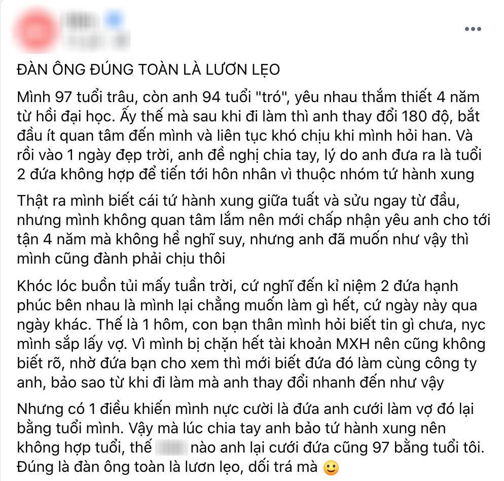 Tuy nhiên, chỉ ít lâu sau cô lại nghe một tin “sét đánh ngang tai” khi biết anh sắp lấy vợ. Cô vợ sắp cưới của anh lại làm cùng công ty. Điều đáng nói, người này lại bằng tuổi với cô, tức cũng là tuổi Sửu sinh năm 1997. Cô ấm ức: “Vậy mà lúc chia tay anh bảo tứ hành xung nên không hợp tuổi , thế nào anh lại cưới đứa cũng 97 bằng tuổi tôi. Đúng là đàn ông toàn là lươn lẹo, dối trá mà”.