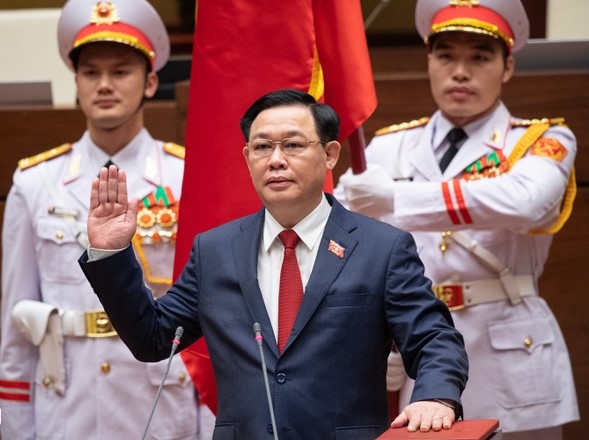 Bước lên bục tuyên thệ, tân Chủ tịch Quốc hội Vương Đình Huệ đặt tay lên Hiến pháp và tuyên thệ: “Trước cờ đỏ sao vàng thiêng liêng, trước Quốc hội, trước đồng bào cử tri cả nước, tôi Chủ tịch Quốc hội nước Cộng hòa xã hội chủ nghĩa Việt Nam xin tuyên thệ: Tuyệt đối trung thành với Tổ quốc, với Nhân dân và Hiến pháp nước Cộng hòa xã hội chủ nghĩa Việt Nam, nỗ lực hoàn thành tốt nhiệm vụ Đảng, Nhà nước và nhân dân giao phó".