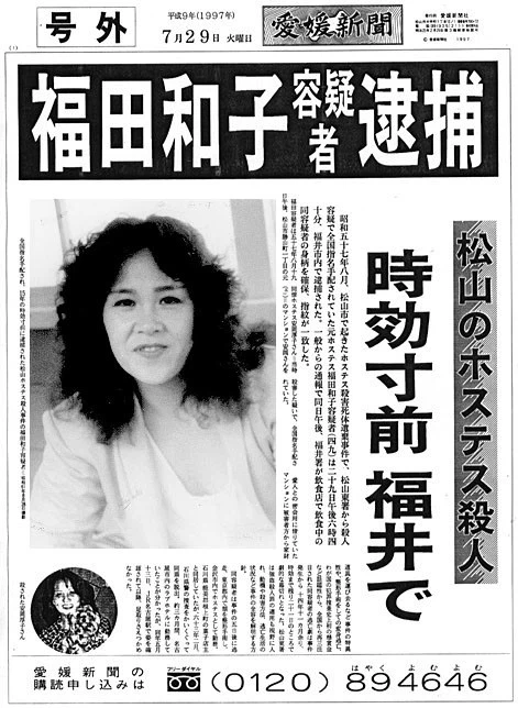 Trang nhất của tờ báo Ehime Shimbun số ra ngày 29 tháng 7 năm 1997 chạy dòng tít lớn: “Nghi phạm Kazuko Fukuda bị bắt" như một lời thông báo cho "chiến công" hiển hách của cảnh sát sau gần 15 năm đằng đẵng đuổi theo kẻ sát nhân.
