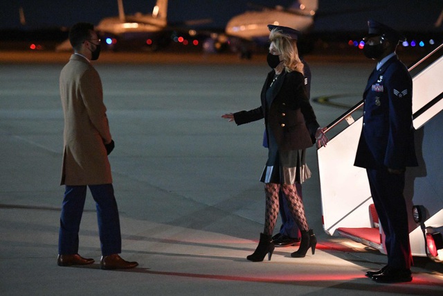 Bà Biden, 69 tuổi, mặc quần tất hoa văn khi di chuyển về căn cứ quân sự Andrews ở Maryland trên chuyên cơ Không lực Một hôm 1/4. Các bức ảnh chụp cho thấy bà mặc áo khoác đen, váy đen dài trên đầu gối, bốt cao gót đen và quần tất màu đen có họa tiết đan chéo.