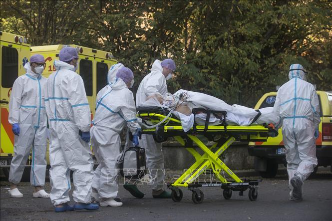 Chuyển bệnh nhân nhiễm COVID-19 tới bệnh viện ở Prague, CH Séc. Ảnh: AFP/TTXVN