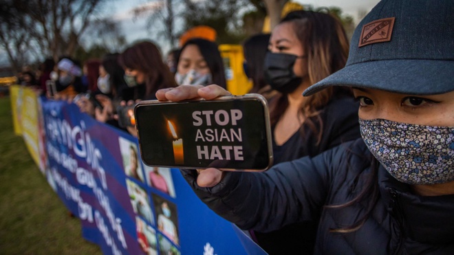 Một người biểu tình kêu gọi dừng nạn kỳ thị đối với người gốc Á ở Mỹ. Ảnh: AFP.