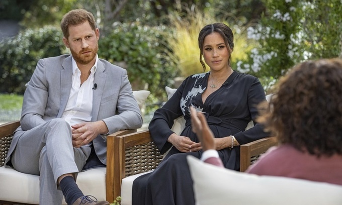Vợ chồng Harry và Meghan trong cuộc phỏng vấn với kênh truyền hình Mỹ được phát sóng tối 7/3. Ảnh: CBS.