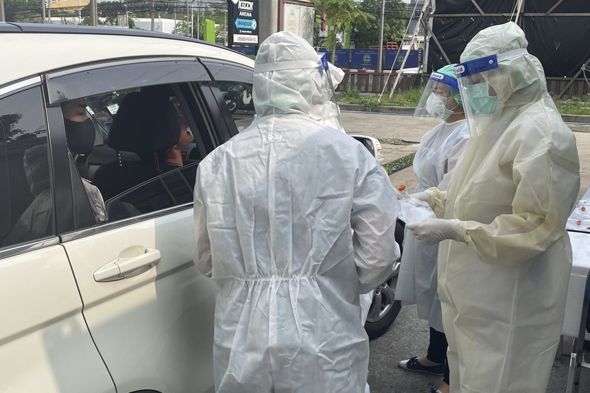 Các nhân viên y tế tiến hành xét nghiệm cho hành khách tại cơ sở xét nghiệm Covid-19. Ảnh: AP.Tết Songkran vắng lặng