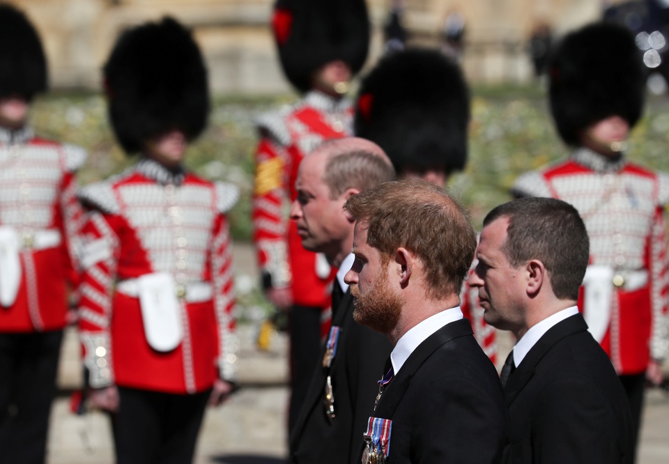 Khi đi theo sau xe tang chở linh cữu ông nội, Hoàng tử Harry và anh trai William không đi cạnh nhau. Đi giữa hai hoàng tử là Peter Phillips, con trai của Công chúa Anne. Lần cuối anh em William và Harry xuất hiện cùng nhau trước công chúng là tại ngày lễ của Khối thịnh vượng chung vào tháng 3/2020. Ảnh: Reuters.