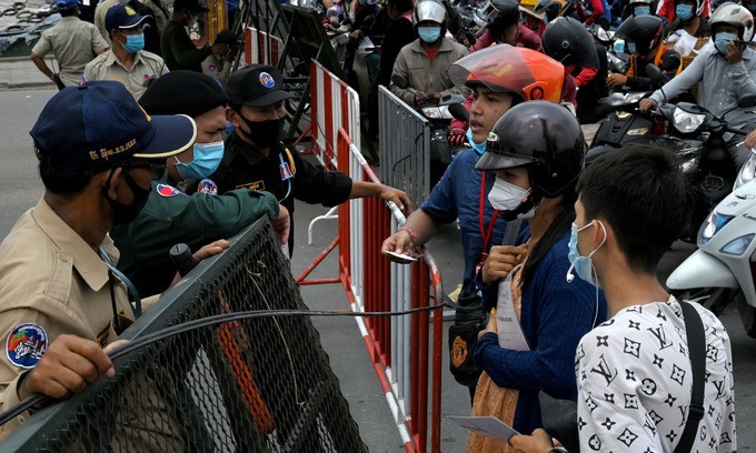 Một chốt kiểm soát phong tỏa ở Phnom Penh hôm 17/4. Ảnh: AFP.