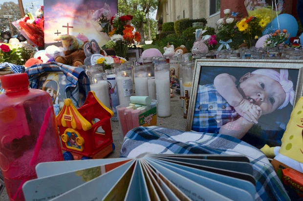 Ảnh, nến, hoa và bóng bay được đặt làm đài tưởng niệm ba đứa trẻ đã bị giết tại căn hộ Royal Villa ở khu Reseda, Los Angeles