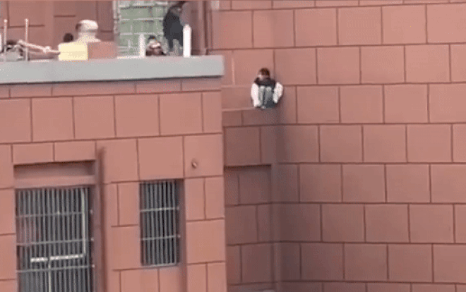 Video được người sống ở tòa nhà đối diện ghi lại cho thấy cô gái ngồi trên mép tường rất nguy hiểm, chỉ trực chờ nhảy xuống. Xung quanh lúc này đã có các nhân viên cứu hộ và vài người được cho là người thân đang cố gắng khuyên nhủ cô gái từ bỏ ý định dại dột.
