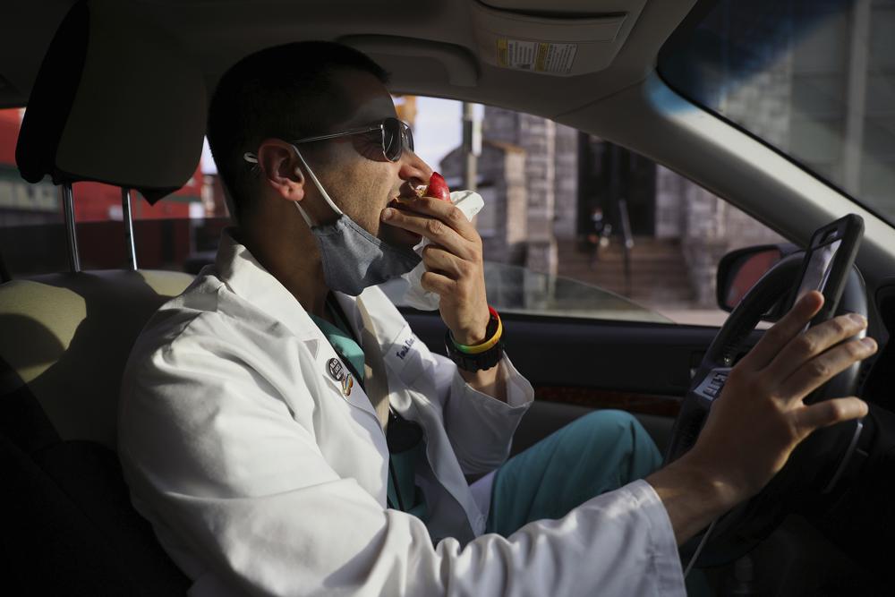 Khan vừa lái xe vừa gọi điện liên hệ với bệnh nhân sắp đến. Ảnh: AP