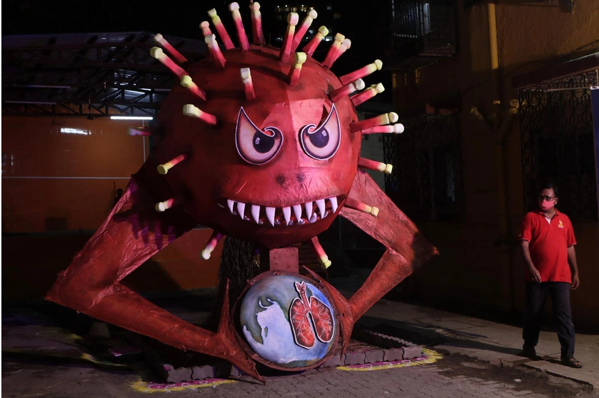 Một người mặc đồ hóa trang virus corona trong lễ hội ở Mumbai hôm 28/3. Ảnh: AP.