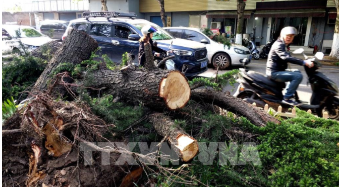Cây cối bị quật đổ do giông bão tại thành phố Nam Thông, tỉnh Giang Tô, miền đông Trung Quốc, ngày 1/5/2021. Ảnh: THX/ TTXVN