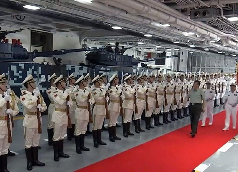 Hôm 23/4, ông Tập Cận Bình thị sát tàu tấn công đổ bộ Hải Nam vừa được đưa vào biên chế Hạm đội Nam Hải (Ảnh: Đa Chiều).