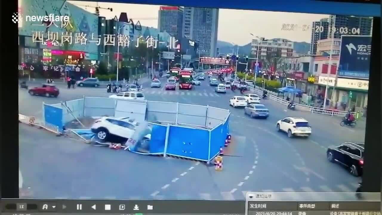 Khoảng 19 giờ ngày 20/4, camera an ninh ở một ngã tư ở thành phố Trương Gia Khẩu ghi lại hình ảnh chiếc crossover màu trắng rơi xuống hố sâu, sau khi đâm xuyên qua tường rào bảo vệ của một công trường xây dựng.