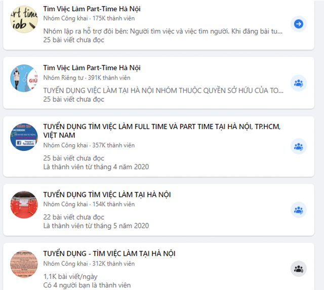 Chỉ cần nhập cụm từ tìm kiếm: "Tìm việc làm" trên Facebook thì hàng loạt các hội nhóm có hàng trăm nghìn thành viên trong đó. Điều đặc biệt là nội dung không có sự kiểm duyệt, đối tượng hướng đến là những bạn sinh viên nhẹ dạ cả tin.