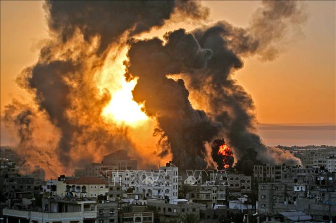 Khói lửa bốc lên sau loạt không kích của Israel xuống Dải Gaza ngày 11/5/2021. Ảnh: AFP/TTXVN