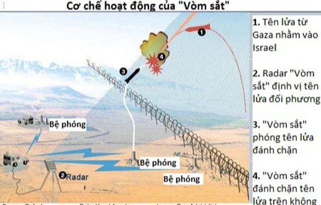 Hệ thống phòng thủ tên lửa "Vòm sắt" (Iron Dome) được cho là đóng vai trò quan trọng trong nỗ lực của Israel đánh chặn "mưa" tên lửa từ Gaza. Vòm sắt là hệ thống phòng không do các doanh nghiệp quốc phòng của Israel sản xuất với sự hỗ trợ cả về tài chính và công nghệ của Mỹ.