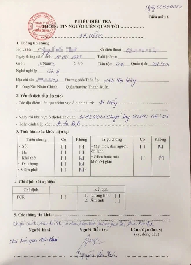 Theo thông tin trên phiếu điều tra này, thời gian là ngày 3/5/2021, trong đó có nêu chuyến bay từ Đà Nẵng về Hà Nội của vợ chồng ông T. là chuyến VN160 ngày 2/5/2021.