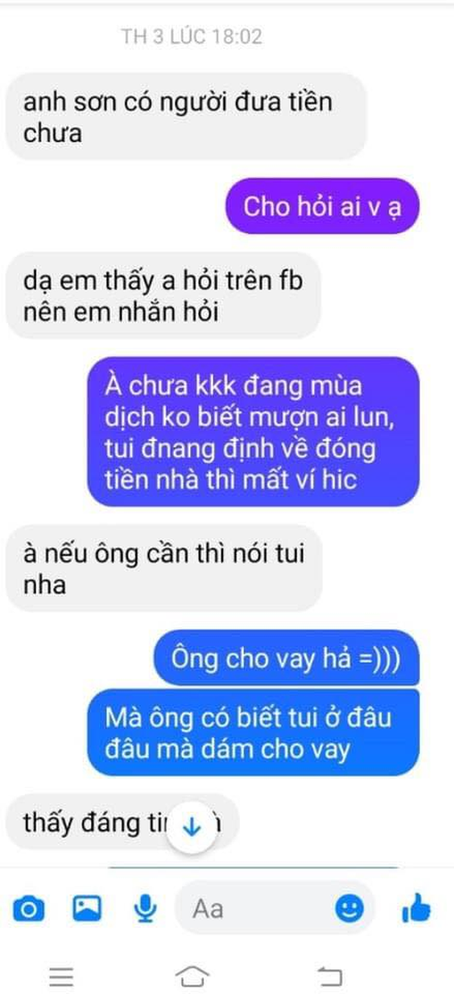 - Dạ em thấy anh hỏi trên facebook nên em nhắn hỏi", đây chính là đoạn mở đầu của câu chuyện. Người kia chủ động hỏi han rồi cho vay vì lí do "thấy đáng tin".