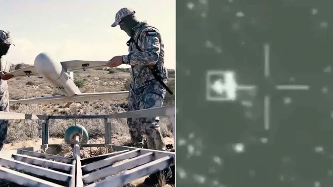 Các chiến binh Palestine chuẩn bị phóng một máy bay không người lái Shehab (bên trái) và một trong những UAV được nhìn thấy qua camera hồng ngoại (bên phải)