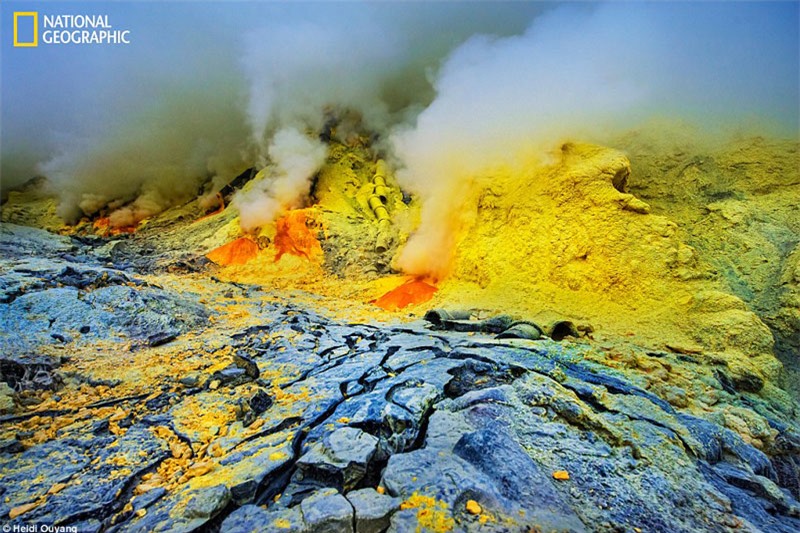 Lưu huỳnh đang phun trào ở núi lửa Ijen, Indonesia. Ảnh: Heidi Ouyang.