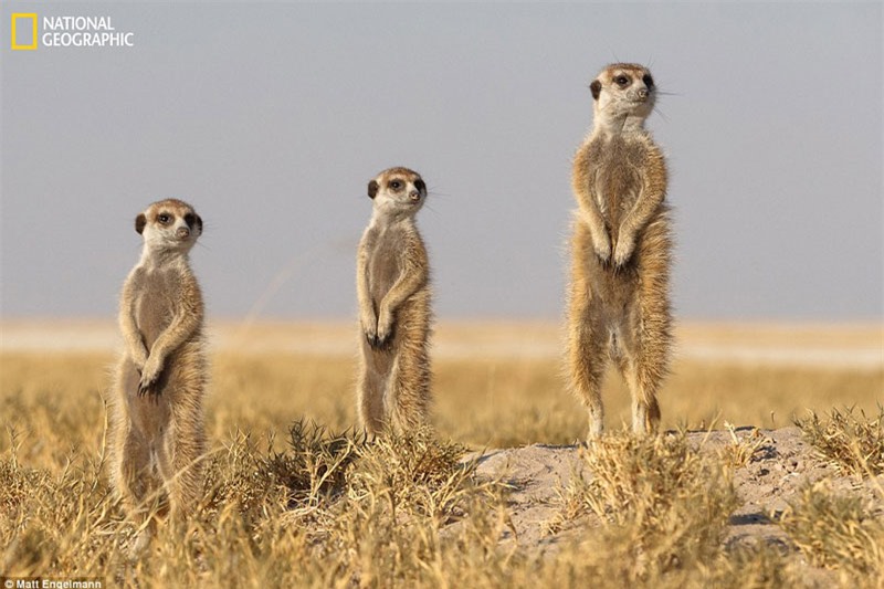 Chồn Meerkats xếp thành hàng ở Cộng hòa Botswana. Ảnh: Matt Engelmann.