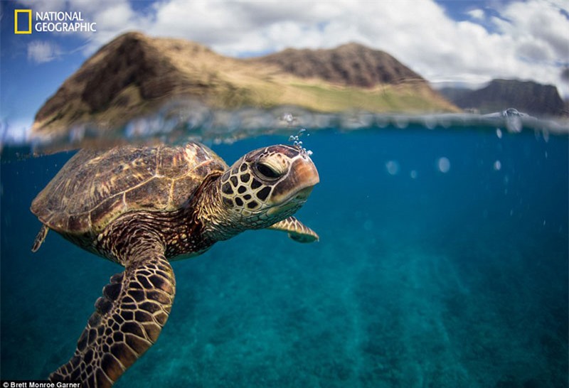 Một con rùa biển xanh đang bơi dưới bờ biển Oahu, Mỹ. Ảnh: Brett Monroe Garner.