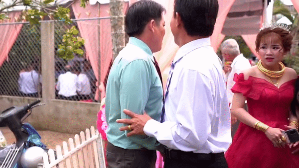 Sau một hồi dỗ dành không được, một người đàn ông khác (có lẽ là ông thông gia, vì mặt ông trông tươi lắm) quyết định "hộ tống" bố cô dâu lội ngược vào trong chia tay con. Ông ôm cả con gái và con rể, dặn dò mấy câu rồi tạm biệt. Đi được vài bước, ông lại... quay lại, hai cha con ôm chầm lấy nhau mà khóc rồi mới thực sự ra về.