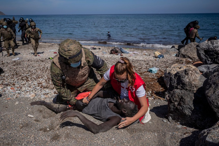 Tình nguyện viên tổ chức Chữ Thập đỏ an ủi một người nhập cư đang hoảng loạn sau khi vượt biển tới Ceuta. Ảnh: Washington Post.