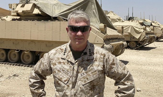 Đại tướng Frank McKenzie đứng trước dàn thiết giáp M2 Bradley tại một căn cứ của Mỹ ở Syria ngày 21/5. Ảnh: AP.