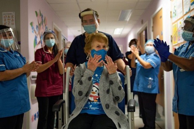 Người phụ nữ đầu tiên được tiêm vaccine Covid-19 tại Anh. Ảnh: Vatican News.