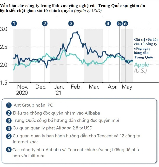Theo Nikkei Asian Review, giá trị vốn hóa của 10 tập đoàn hàng đầu ngành IT và công nghệ cao Trung Quốc - bao gồm Tencent Holdings và Alibaba Group Holdings - giảm hơn 30% so với mức đỉnh hồi tháng 2.
