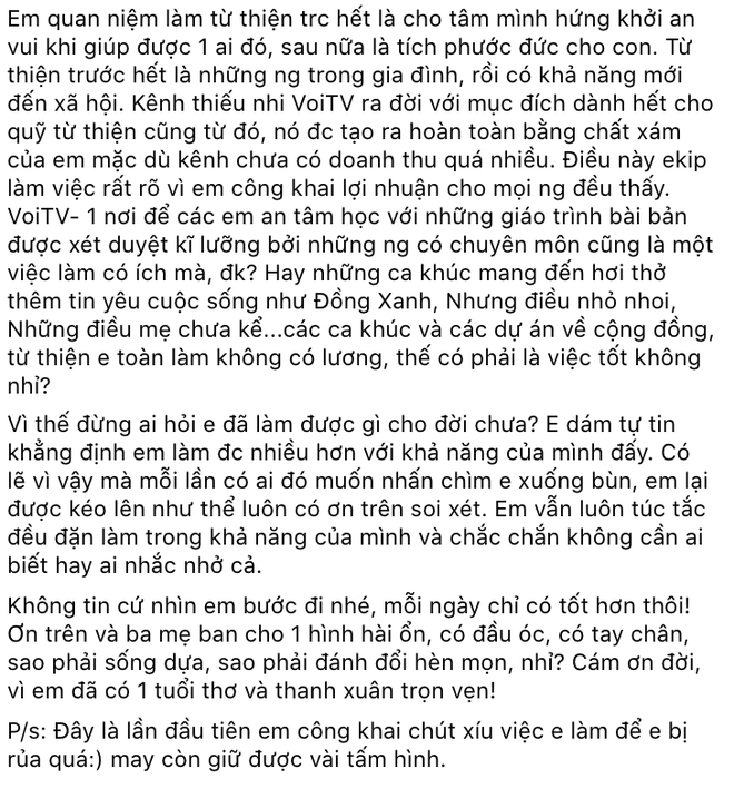 Trước ý kiến này, Vy Oanh đã chia sẻ tâm thư dài đính kèm loạt hình ảnh cho thấy bản thân đã có rất nhiều việc làm ý nghĩa. Cô đăng kèm bản sao kê của những khoản tiền được gửi đi làm từ thiện, khẳng định cho đi và sẻ chia chính là truyền thống của gia đình.
