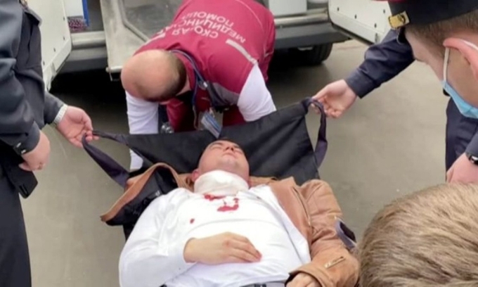 Nhà hoạt động Stepan Latypov (áo trắng) được đưa tới bệnh viện sau khi tự cắt cổ giữa phiên tòa ở thủ đô Minsk, Belarus, hôm 1/6. Ảnh: Reuters.