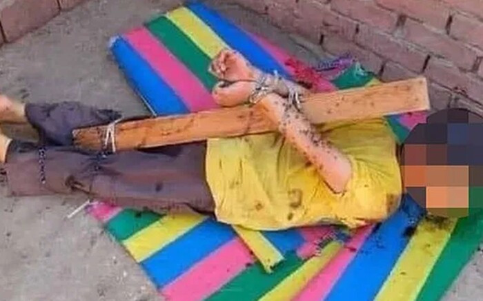 Bức ảnh gây sốc cho thấy đứa trẻ, được xác định là Muhammad D, nằm trên đất với hai tay bị trói vào cột gỗ sau lưng, trong khi những con ong đậu khắp trên người cậu.