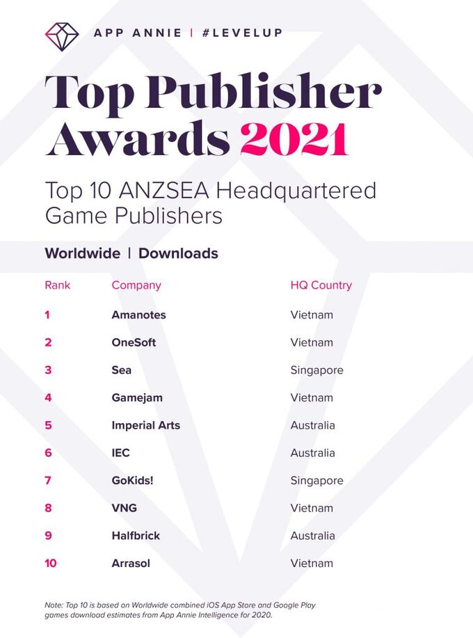 Thống kê của App Annie - công ty phân tích và dữ liệu di động uy tín bậc nhất hiện nay - đánh giá Việt Nam là thị trường lớn khi vừa là nơi đặt trụ sở của các nhà phát hành trò chơi và ứng dụng, vừa có người tiêu dùng ưu tiên thiết bị di động. Quốc gia này là quê hương của 5 trong số 10 nhà phát hành trò chơi hàng đầu tại ANZ SEA (Australia, New Zealand và Đông Nam Á). Các công ty game Việt Nam cũng đứng thứ 7 trong bảng xếp hạng lượt game được tải nhiều nhất thế giới. "Cứ 25 game được tải, có một game do công ty Việt Nam sản xuất", báo cáo của App Annie nhấn mạnh.