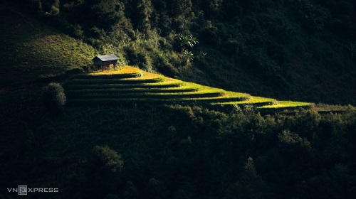Nếp nhà nằm lẻ loi trên những thửa ruộng bậc thang chín vàng ở Mù Cang Chải, Yên Bái. Một trong những cung đường yêu thích ngắm lúa chín vào mùa thu nằm ở Yên Bái là Khau Phạ - Thung lũng Lìm Mông, Lìm Thái - Tú Lệ - Mù Cang Chải.
