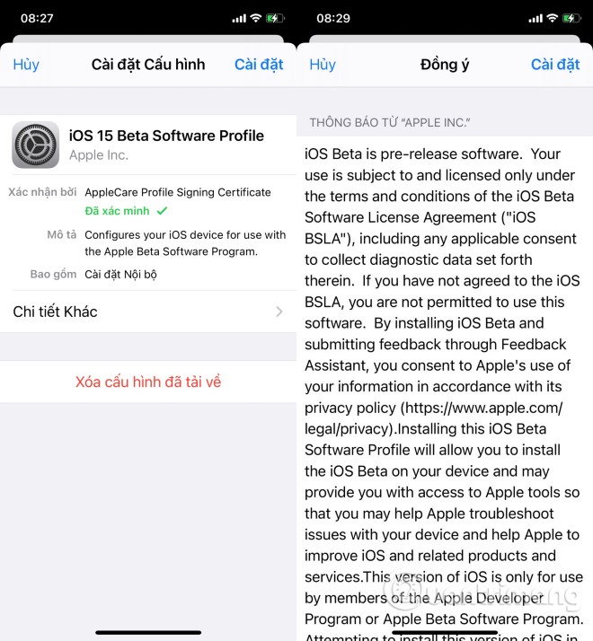 Bước 4: Mở Cài đặt > chọn Đã tải về hồ sơ. ngay bên dưới tên iCloud của bạn > chọn Cài đặt. Bạn có thể cần nhập mật khẩu > đồng ý các chính sách và điều khoản, sau đó ấn Cài đặt ở góc trên bên phải và ấn tiếp lần nữa ở cuối màn hình.