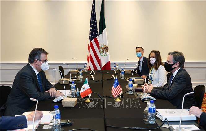 Ngoại trưởng Mexico Marcelo Ebrard (trái) và người đồng cấp Mỹ Anthony Blinken (phải) tại cuộc gặp ở San Jose, Costa Rica ngày 2/6/2021. Ảnh: AFP/TTXVN