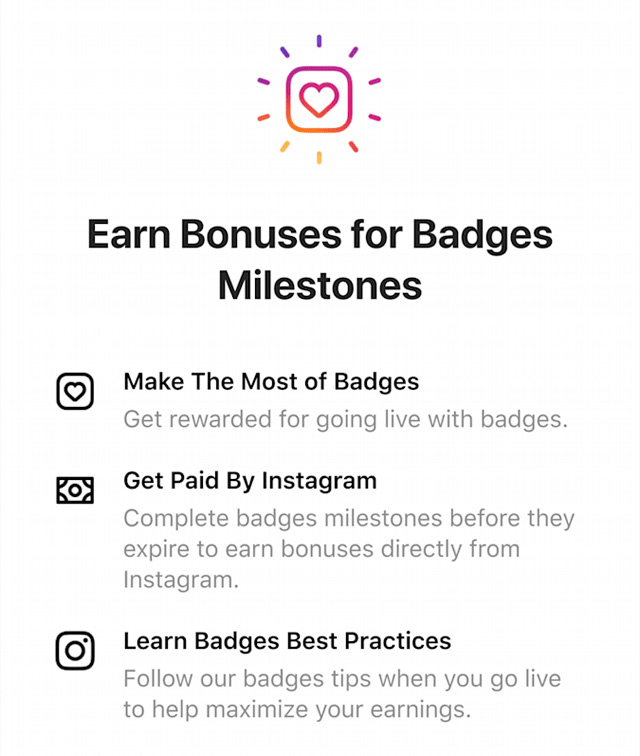 Những người sáng tạo có thể kiếm thêm tiền “khi đại được một số mốc nhất định”. Trên Instagram, người sáng tạo có thể kiếm được “tiền thưởng” bằng cách bán một số Huy hiệu nhất định trong Livestream của họ hoặc phát trực tuyến bằng tài khoản khác.